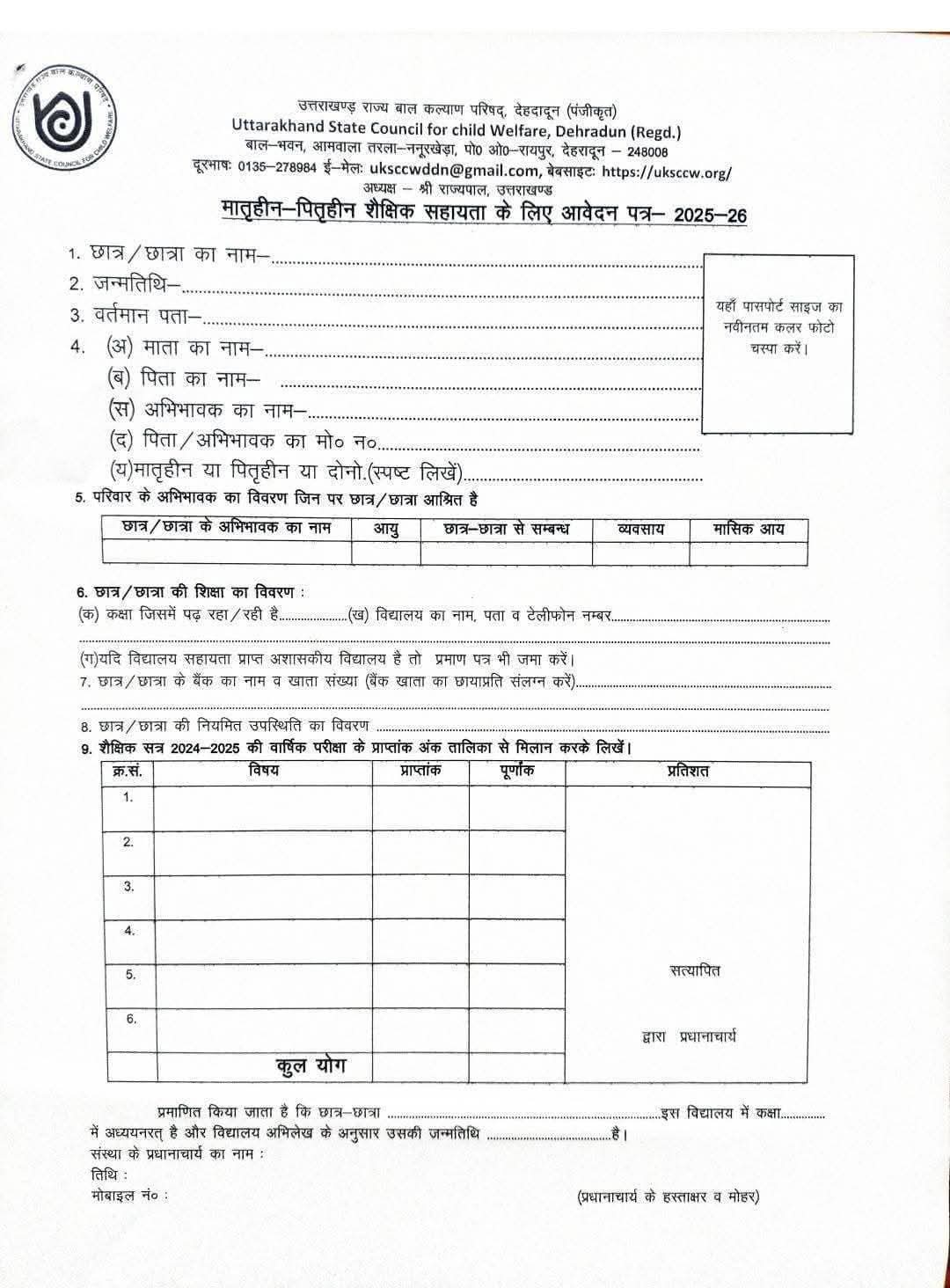 मातृहीन पितृहीन शैक्षिक सहायता के लिए आवेदन पत्र 2025-26 |